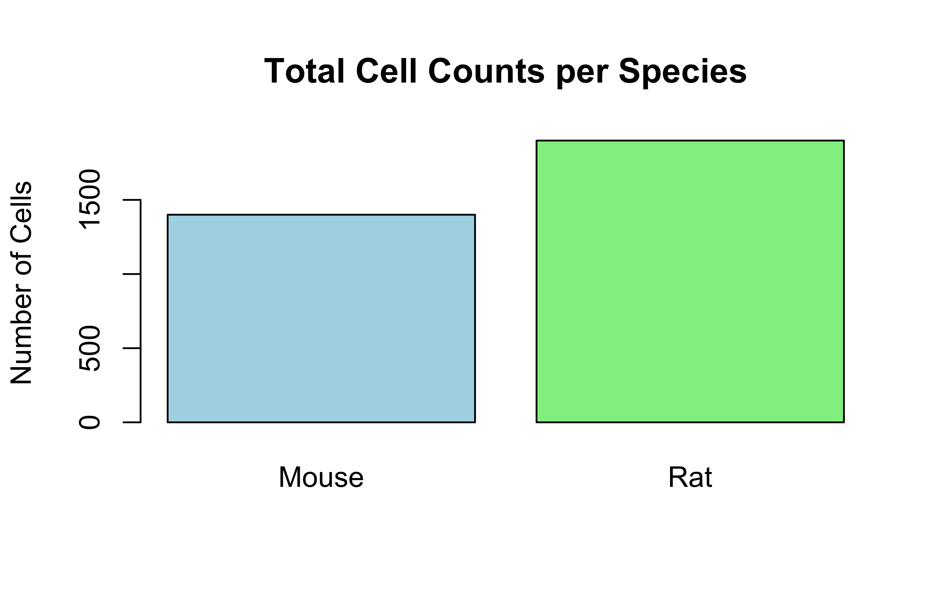 # --- Simple plots ---# Bar plot of total cells per speciesbarplot(Total_Cells_Per_Species, main="Total Cell Counts per Species", ylab="Number of Cells", col=c("lightblue", "lightgreen"))