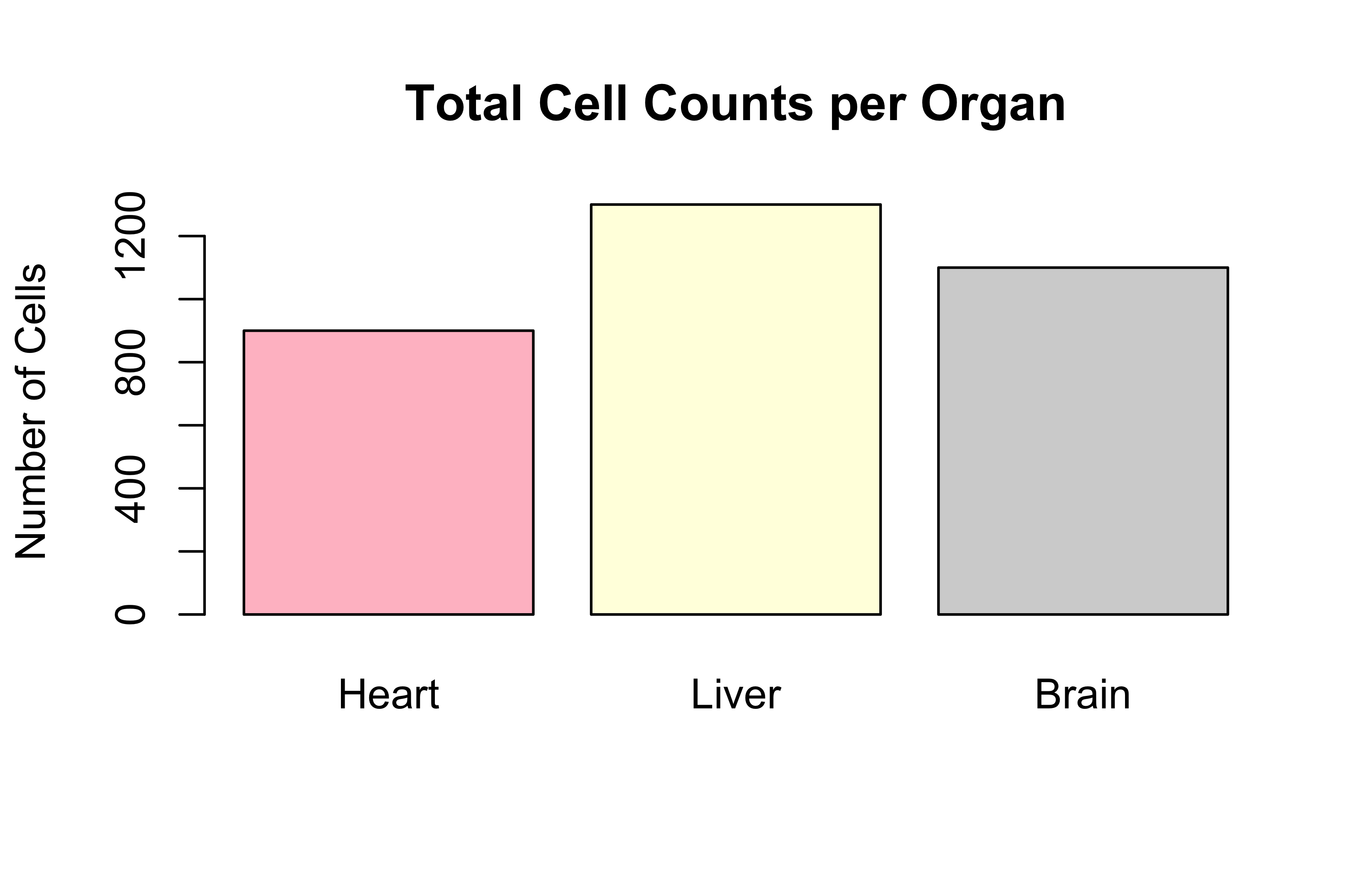 # Bar plot of total cells per organbarplot(Total_Cells_Per_Organ, main="Total Cell Counts per Organ", ylab="Number of Cells", col=c("pink", "lightyellow", "lightgray"))