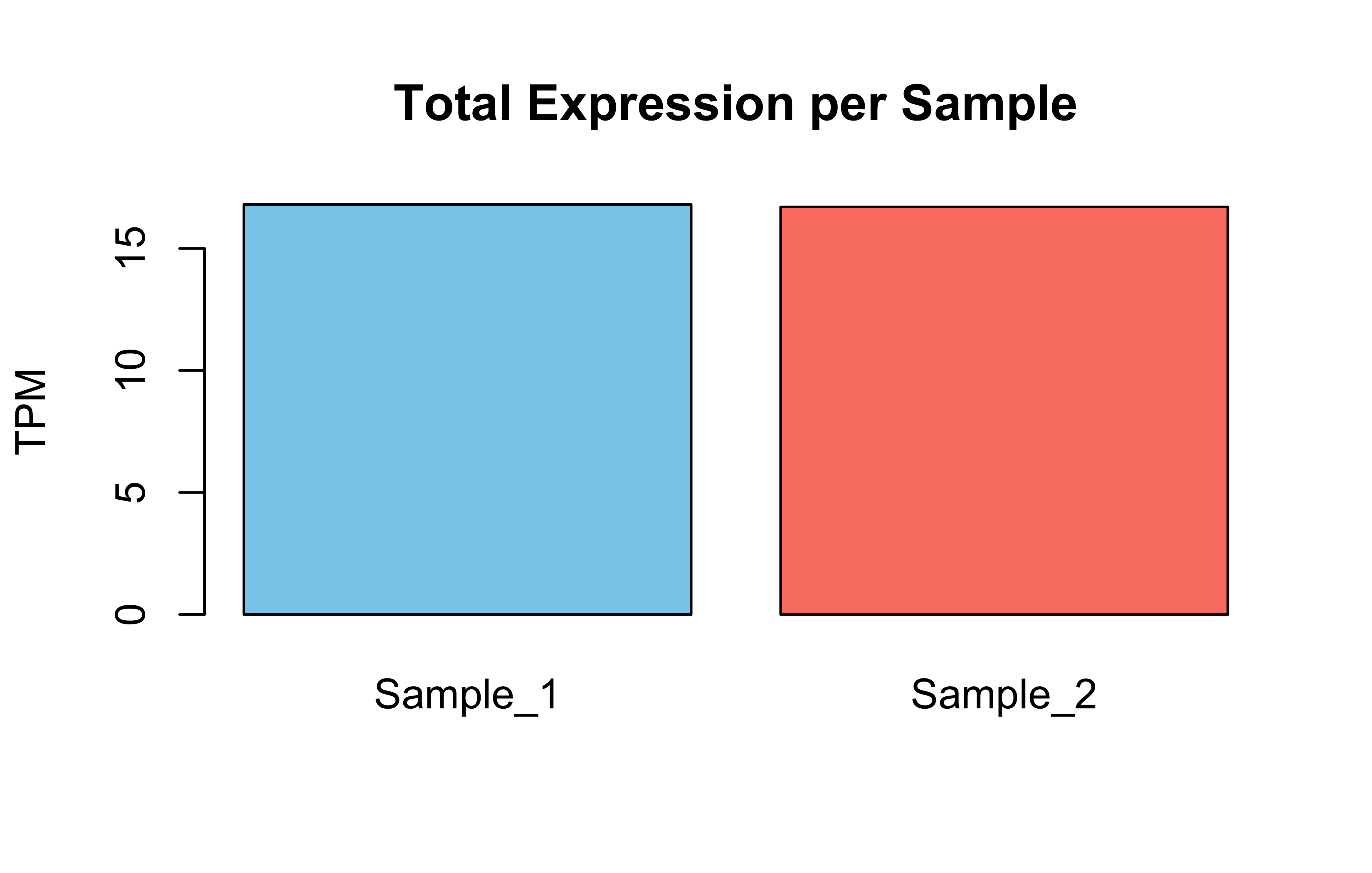 # 7. Simple plots # Barplot: Total expression per samplebarplot(Total_Expression_Per_Sample, main="Total Expression per Sample", ylab="TPM", col=c("skyblue", "salmon"))