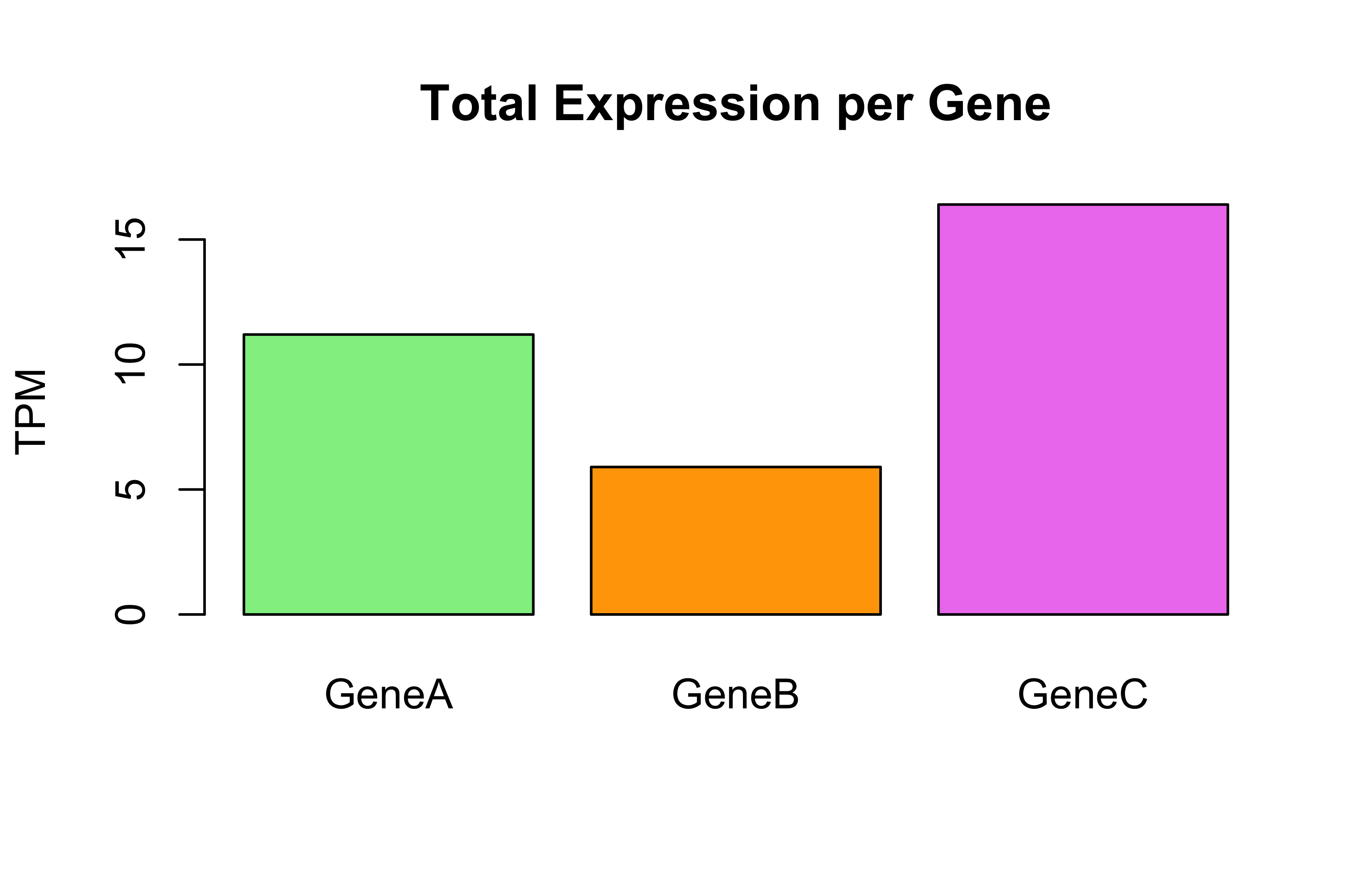 # Barplot: Total expression per genebarplot(Total_Expression_Per_Gene, main="Total Expression per Gene", ylab="TPM", col=c("lightgreen", "orange", "violet"))