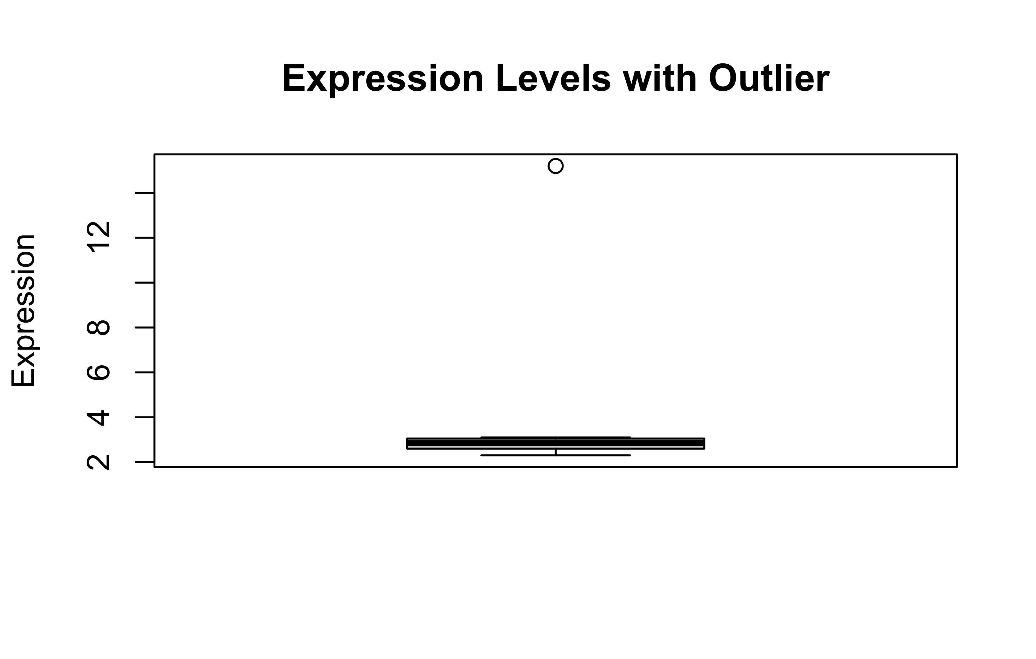 # Create data with outliersexpression_levels<-c(2.3, 2.7, 3.1, 2.9, 2.5, 3.0, 15.2, 2.8)boxplot(expression_levels, main ="Expression Levels with Outlier", ylab ="Expression")