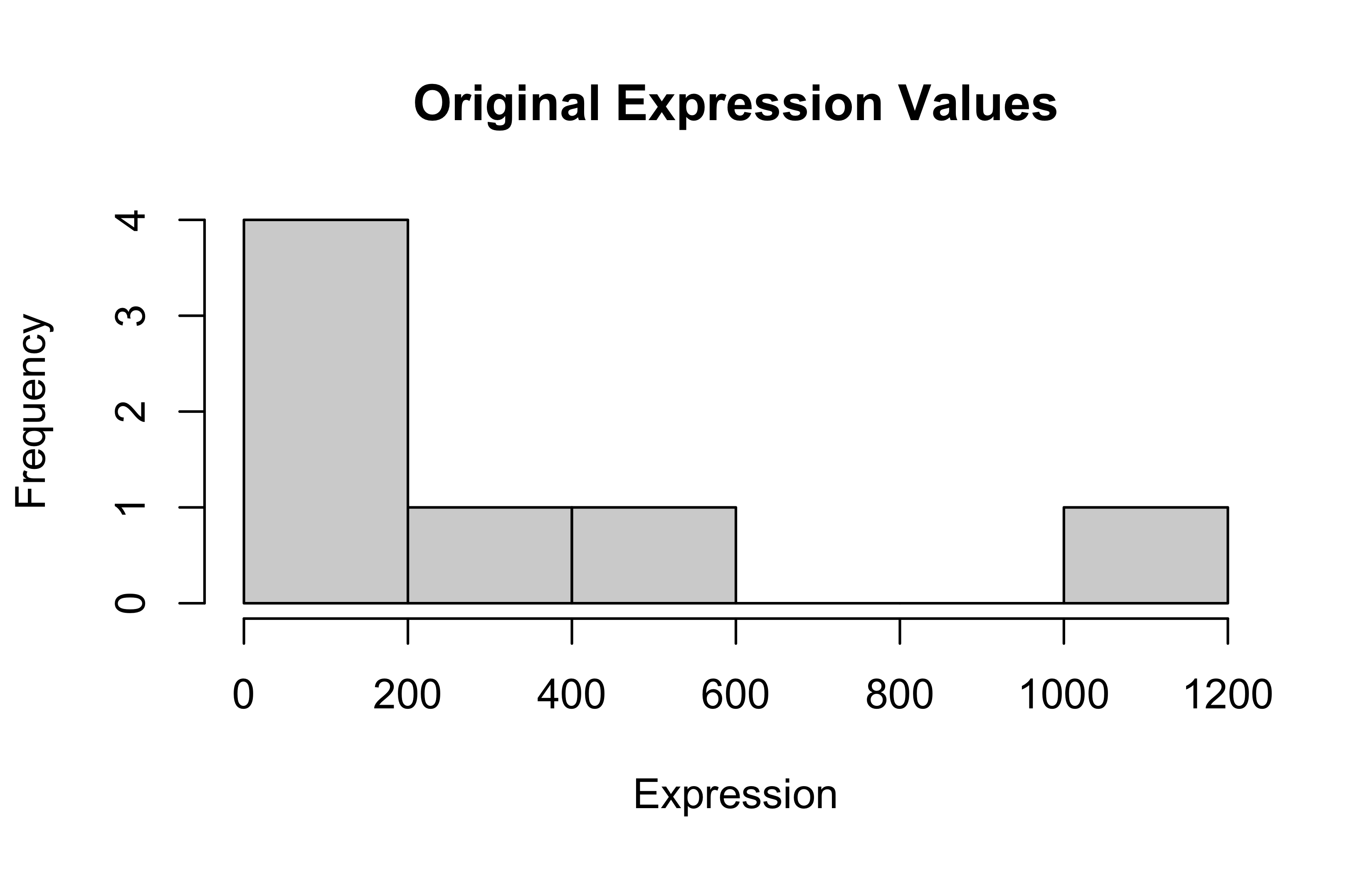 # Original datagene_exp<-c(15, 42, 87, 115, 320, 560, 1120)hist(gene_exp, main ="Original Expression Values", xlab ="Expression")