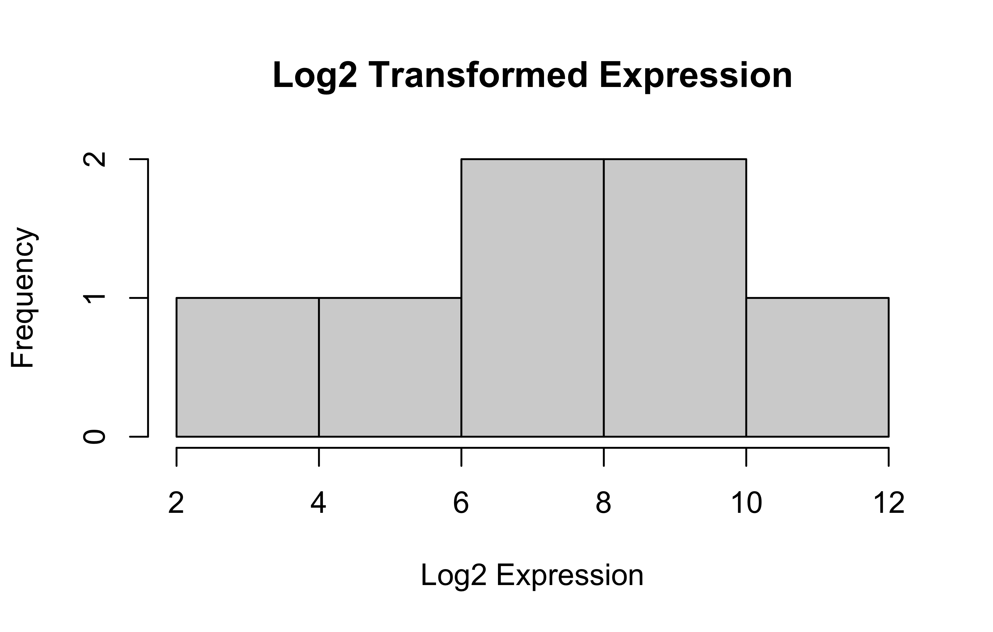 # Log transformation (common in gene expression analysis)log_exp<-log2(gene_exp)hist(log_exp, main ="Log2 Transformed Expression", xlab ="Log2 Expression")