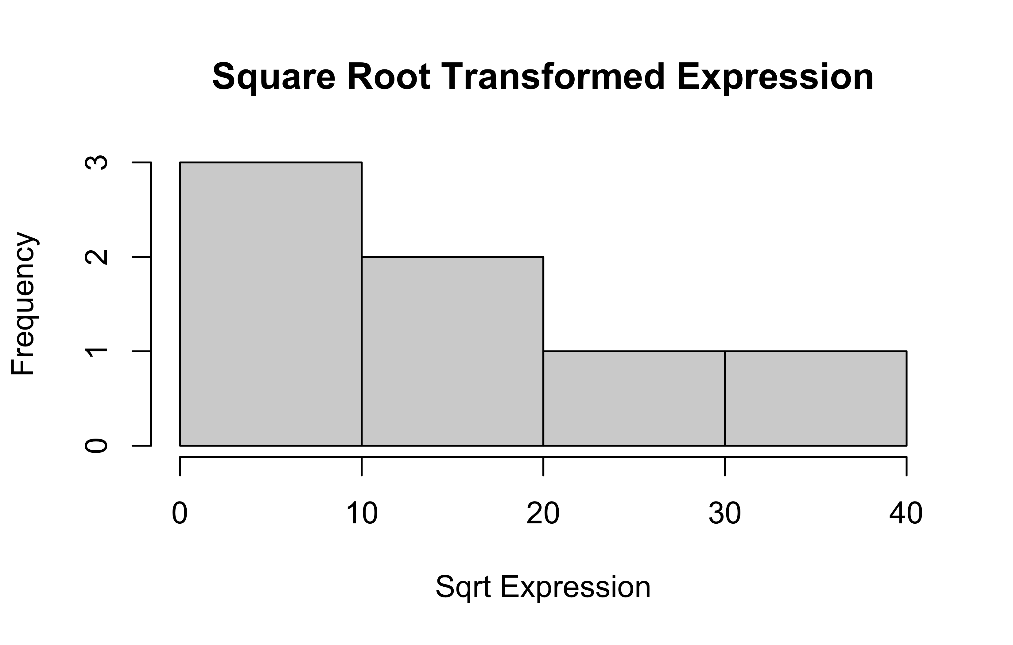 # Square root transformation (less aggressive than log)sqrt_exp<-sqrt(gene_exp)hist(sqrt_exp, main ="Square Root Transformed Expression", xlab ="Sqrt Expression")