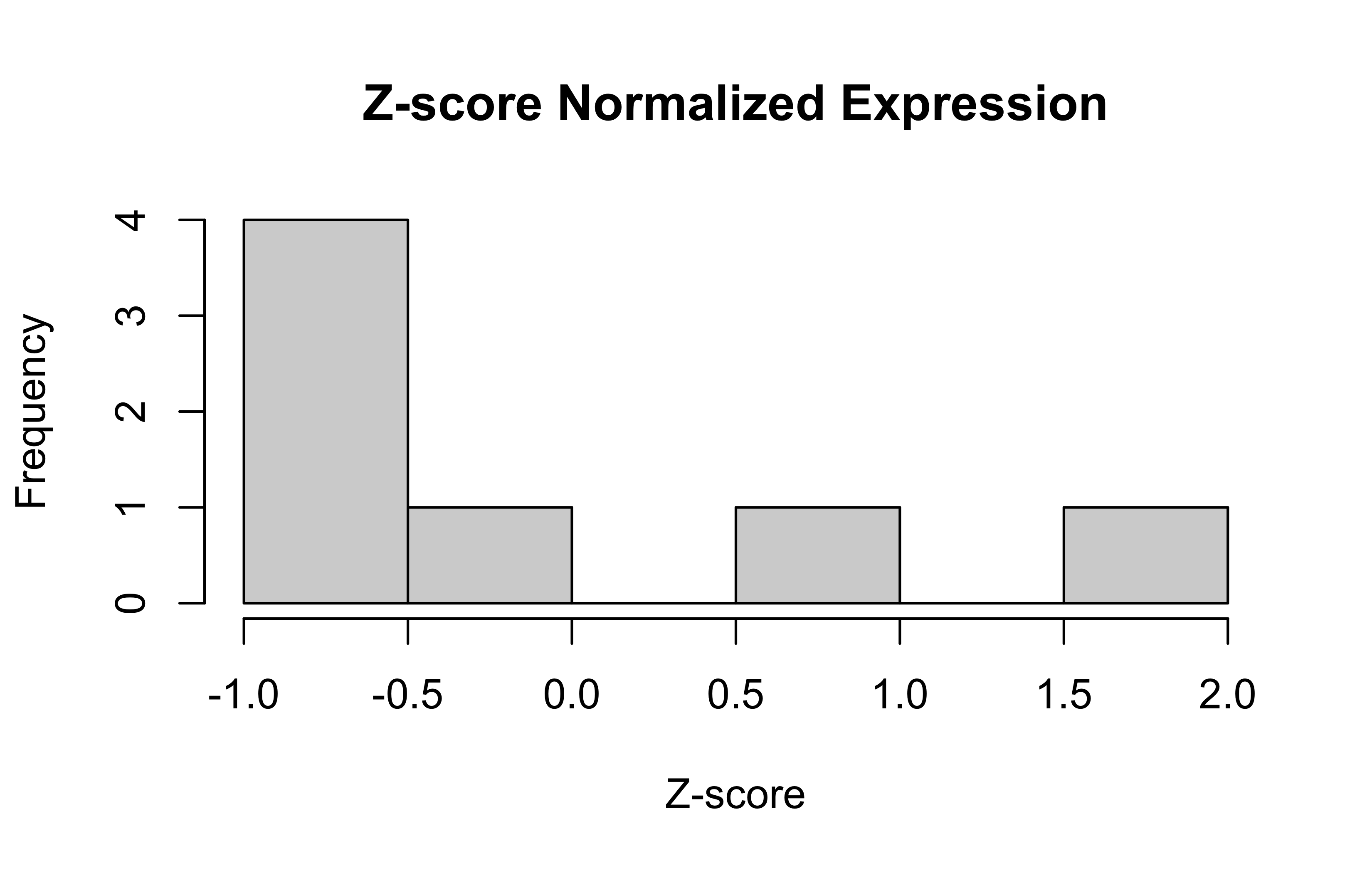# Z-score normalization (standardization)z_exp<-scale(gene_exp)hist(z_exp, main ="Z-score Normalized Expression", xlab ="Z-score")