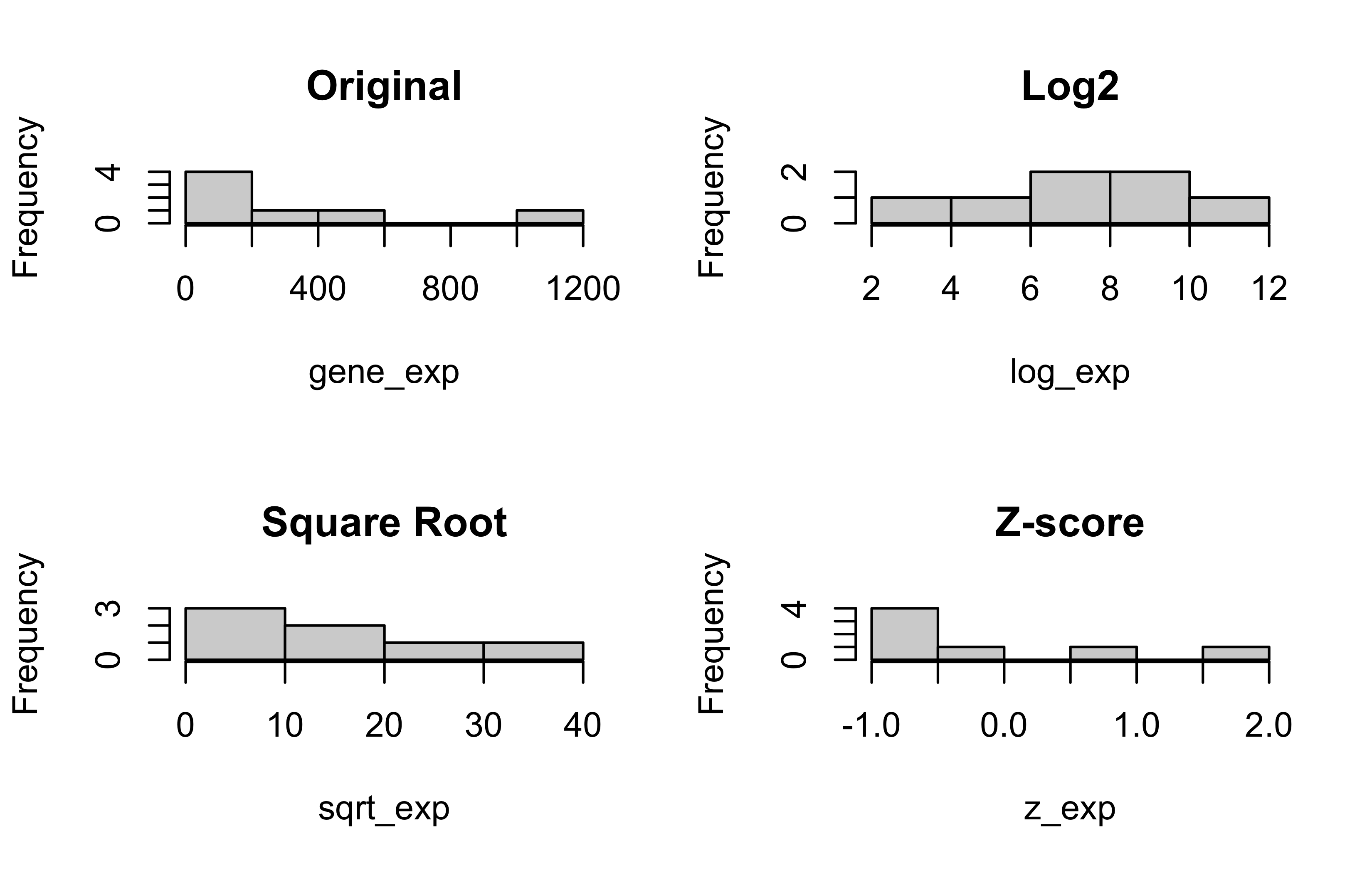 # Compare transformationspar(mfrow =c(2, 2))hist(gene_exp, main ="Original")hist(log_exp, main ="Log2")hist(sqrt_exp, main ="Square Root")hist(z_exp, main ="Z-score")
