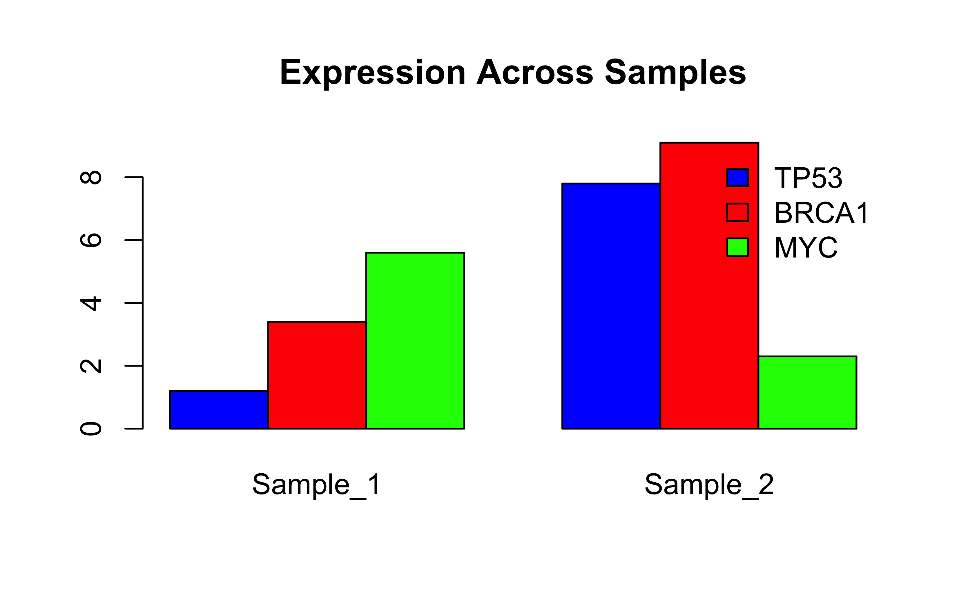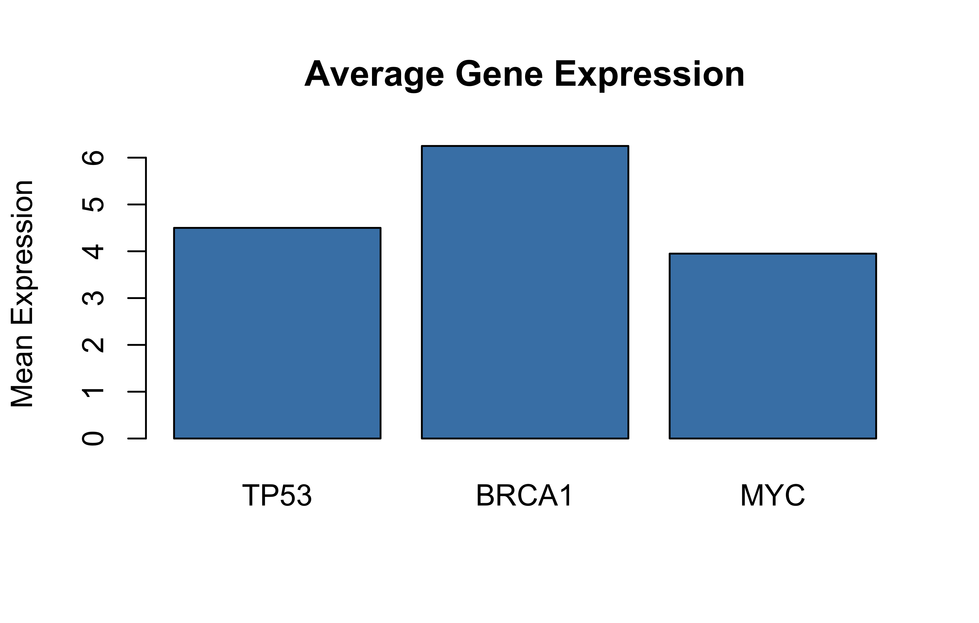 # Base R plot from list databarplot(unlist(genomics_data[2]), names.arg =genomics_data[[1]])
