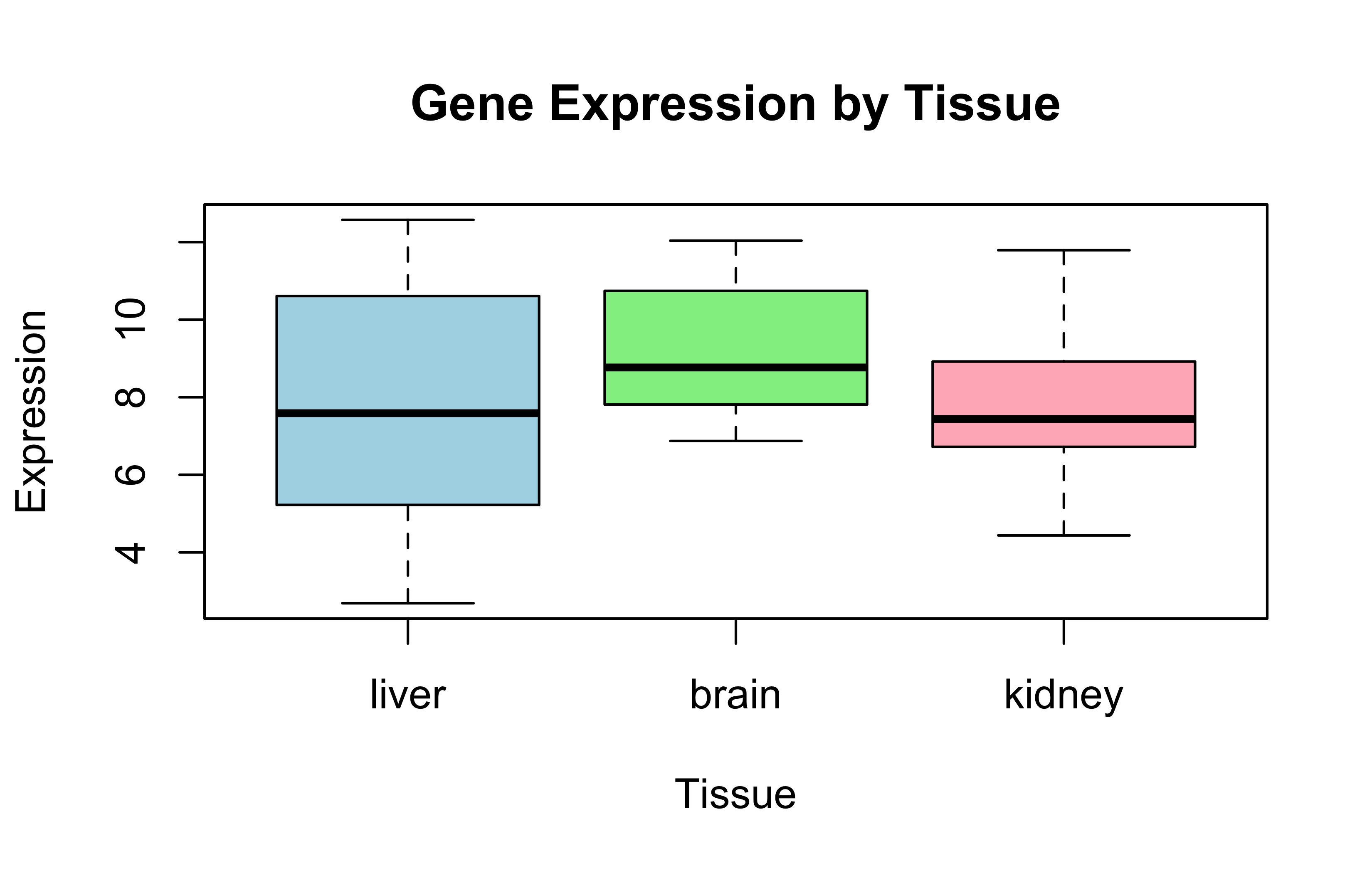 boxplot(expression~tissue, data =expr_data, main ="Gene Expression by Tissue", xlab ="Tissue", ylab ="Expression", col =c("lightblue", "lightgreen", "lightpink"))