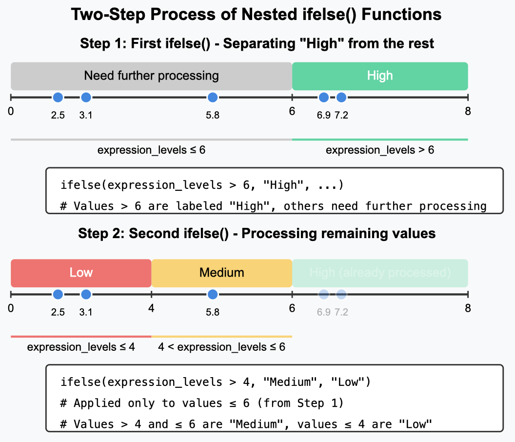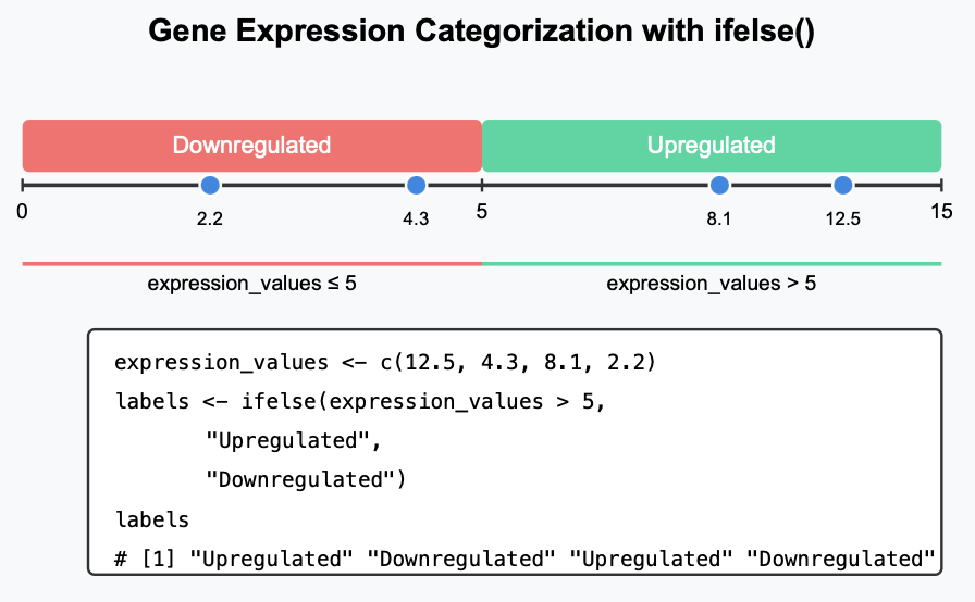 # which() - Get indices of TRUE valueswhich(exp_data>6)# Which elements have expressions > 6?