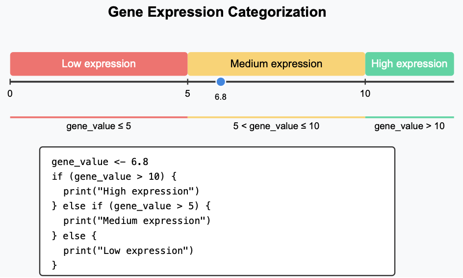 ---title: "Basic R"abstract: "Data types, variables, vectors, data frame, functions"---```{r}#| include: falsesource(here::here("src/helpersrc.R"))```# L2: Data Representation## Using R as a CalculatorLet's do some basic calculation.```{r}5+33+23-23*23/2#normal division7%/%2#integer division, only the quotient5%%3#modulus division, the remainder(10-5)*(2+4) #use of parentheses10-5*2+4#Noticed BODMAS?(10-5)*(2+4) #Noticed BODMAS7/(1+3); 7/1+3#multi-line codes, separated with semi-colon1+2; log(1); 1/10#more multi-line codes```## VariablesVariables are variable. We have freedom to name them as we wish. But make any variable name meaningful and identifiable.```{r}a <-5#assign value 5 to a b =10aba <- a +10b = b +15aa^2#a squareda**2#a squared again, in a different way.a^3#a qubed```::: callout-note`<-` and `=` are used to assign values. It is not mathematical equality. `b <- b + 15` might make better sense than `b = b + 15`.:::### Integer and Modulus division againDo some more practice.```{r}7/37%/%37%%3```## RoundingSome important functions we apply on numerical values```{r}x <-9/4floor(x)ceiling(x)round(x)round(x, 2) #round till 2 decimal points```## Logical OperationsGet to know TRUE/FALSE in R.```{r}a =5b =7c =10d =3a == b #is a equal to b? Ans: No/FALSEa != b #is a not equal to b? Ans: Yes/TRUEa > b #is a greater than b? Ans: FALSEa < b #is a less than b? Ans: TRUEa >= b #is a greater than or equal to b? Ans: FALSEa <= b #is a less than or equal to b? Ans: TRUEa < b | d > b #is a less than b OR d greater than b?#It's answer will be TRUE OR FALSE --> So, TRUEa < b & c > d #is a less than b AND a greater than b? It's answer will be TRUE AND TRUE --> So, TRUEa < b & d > c #is a less than b AND a greater than b? It's answer will be TRUE AND FALSE --> So, FALSE```## Help and DocumentationBut how to know more about a function? The package/library developer have written helpful documentation for us.```{r}?logexample(log)?log()```## Working with VectorsWhat is a vector? See the example and think.```{r}x <-c(1, 2, 3, 4, 5) #c means concatenatez <-1:5#consecutively, from 1 through 5. A short-hand notation using :y <-c(3, 6, 9, 12, 15, 20)length(x)mode(x)is(x)x[1] #first entry in vector yx[2:5] #2nd to 5th entries in vector yDNA <-c("A", "T", "G", "C") #character vector. Notice the quotation marks.dec <-c(10.0, 20.5, 30, 60, 80.9, 90, 100.7, 50, 40, 45, 48, 56, 55) #vector of floats. All numbers became floats, it's called coerciondec[c(1:3, 7:length(dec))] #1st to 3rd and then 7th till the end of vector `dec`. Output as a vector.```### Vector OperationsNotice the element-wise or index-wise mathematical operations (`+`, `/`, `log2()`, `round()`, etc.). Noticed?```{r}x <-1:10y <-2:11#x and y are of same lengthx + yy / xlog2(x)round(log2(x), 1) #log2 of all the values of `x`, 1 digit after decimal to round.round(log2(x), 3) #same logic```::: callout-noteNested functions work inside out. Think again about `round(log2(x), 1)` and you will see it. At first, it is making `log2` of vector `x` and then it is rounding the log2 values to one digit after decimal. Got it?:::## Data FrameNow, it's time to use vectors to make data sets.....```{r}names <-c("Mina", "Raju", "Mithu", "Lali")gender <-c("Female", "Male", "Female", "Female")age <-c(15, 12, 2, 3)is_human <-c(TRUE, TRUE, FALSE, FALSE)cartoon <-data.frame(names, gender, age, is_human)write.table(cartoon, "cartoon.csv", sep =",", col.names =TRUE)df <-read.table("cartoon.csv", header =TRUE, sep =",")dim(df) #`dim` means dimension. so, rows * columnsstr(df) #structure of `df````We made the vectors first, and the used them to make the `cartton` data frame or table. We learned how to export the data frame using write.table function. Also, we learned to import or read back the table using `read.table` function. What are the `sep`, `col.names`, `header` arguments there? Why do we need them? Think. Try thinking of different properties of a data set.### Gene Expression Table```{r}gene_expr <-data.frame(genes =c("TP53", "BRCA1", "MYC", "EGFR", "GAPDH", "CDC2"),sample1 =c(8.2, 6.1, 9.5, 7.0, 10.0, 12),Sample2 =c(5.9, 3.9, 7.2, 4.8, 7.9, 9),Sample3 =c(8.25, 6.15, 9.6, 7.1, 10.1, 11.9),pathways =c("Apoptosis", "DNA Repair", "Cell Cycle", "Signaling", "Housekeeping", "Cell Division"))write.table(gene_expr, "gene_expr.csv", sep =",", col.names =TRUE)gene_set <-read.table("gene_expr.csv", header =TRUE, sep =",")```::: callout-noteHere, we directly used the vectors as different columns while making the data frame. Did you notice that? Also, the syntax is different here. We can't assign the vectors with the assignment operator (means we can't use `<-` sign. We have to use the `=` sign). Try using the `<-` sign. Did you notice the column names?:::## Homeworks1. Compute the difference between this year (2025) and the year you started at the university and divide this by the difference between this year and the year you were born. Multiply this with 100 to get the percentage of your life you have spent at the university.2. Make different kinds of variables and vectors with the data types we learned together.3. What are the properties of a data frame?Hint: Open an excel/csv/txt file you have and try to "generalize".4. Can you make logical questions on the 2 small data sets we used? Try. It will help you understanding the logical operations we tried on variables. Now we are going to apply them on vectors (columns) on the data sets. For example, in the `cartoon` data set, we can ask/try to subset the data set filtering for females only, or for both females and age greater than 2 years.5. If you are writing or practicing coding in R, write comment for each line on what it is doing. It will help to chunk it better into your brain.6. Push the script and/or your answers to the questions (with your solutions) to one of your GitHub repo (and send me the repo link).### Deadline**Friday, 10pm BD Time.**# L3: Data TransformationFirstly, how did you solve the problems?Give me your person
