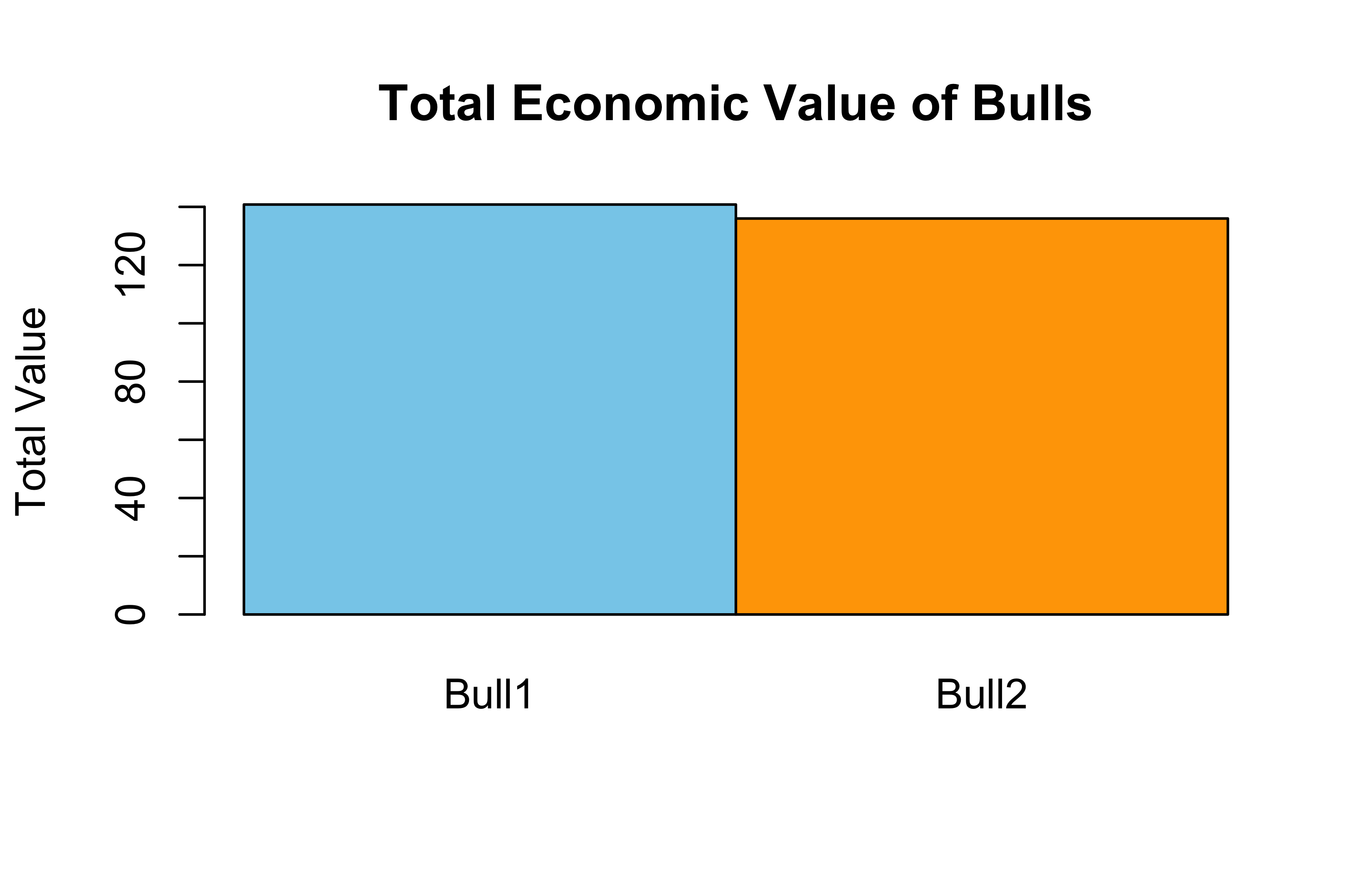 barplot(TotalValue, beside =TRUE, names.arg =rownames(BullEBVs), col =c("skyblue", "orange"), main ="Total Economic Value of Bulls", ylab ="Total Value")