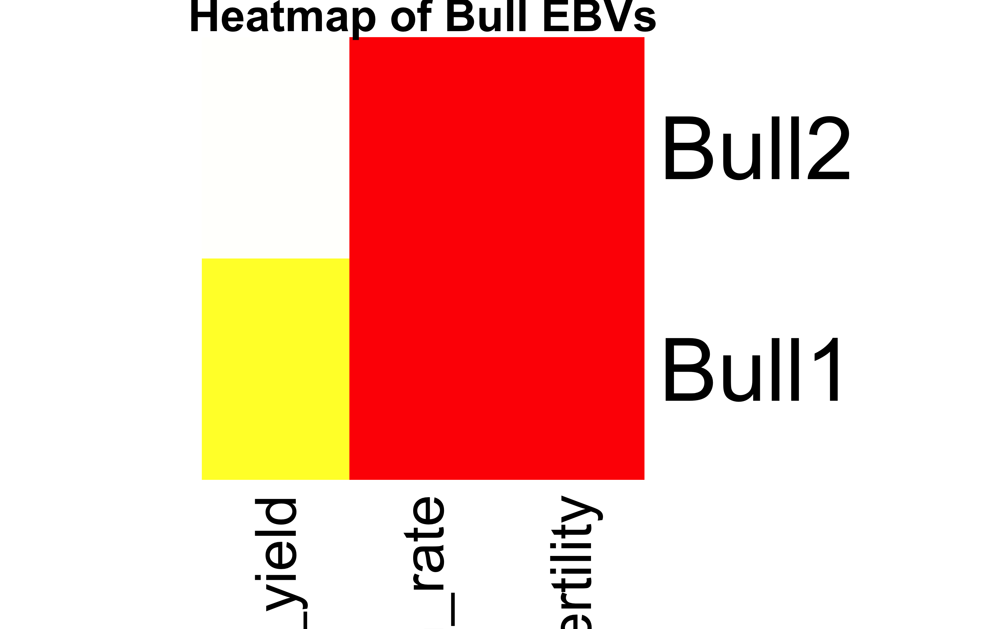 heatmap(BullEBVs, Rowv =NA, Colv =NA, scale ="none", col =heat.colors(256), main ="Heatmap of Bull EBVs")
