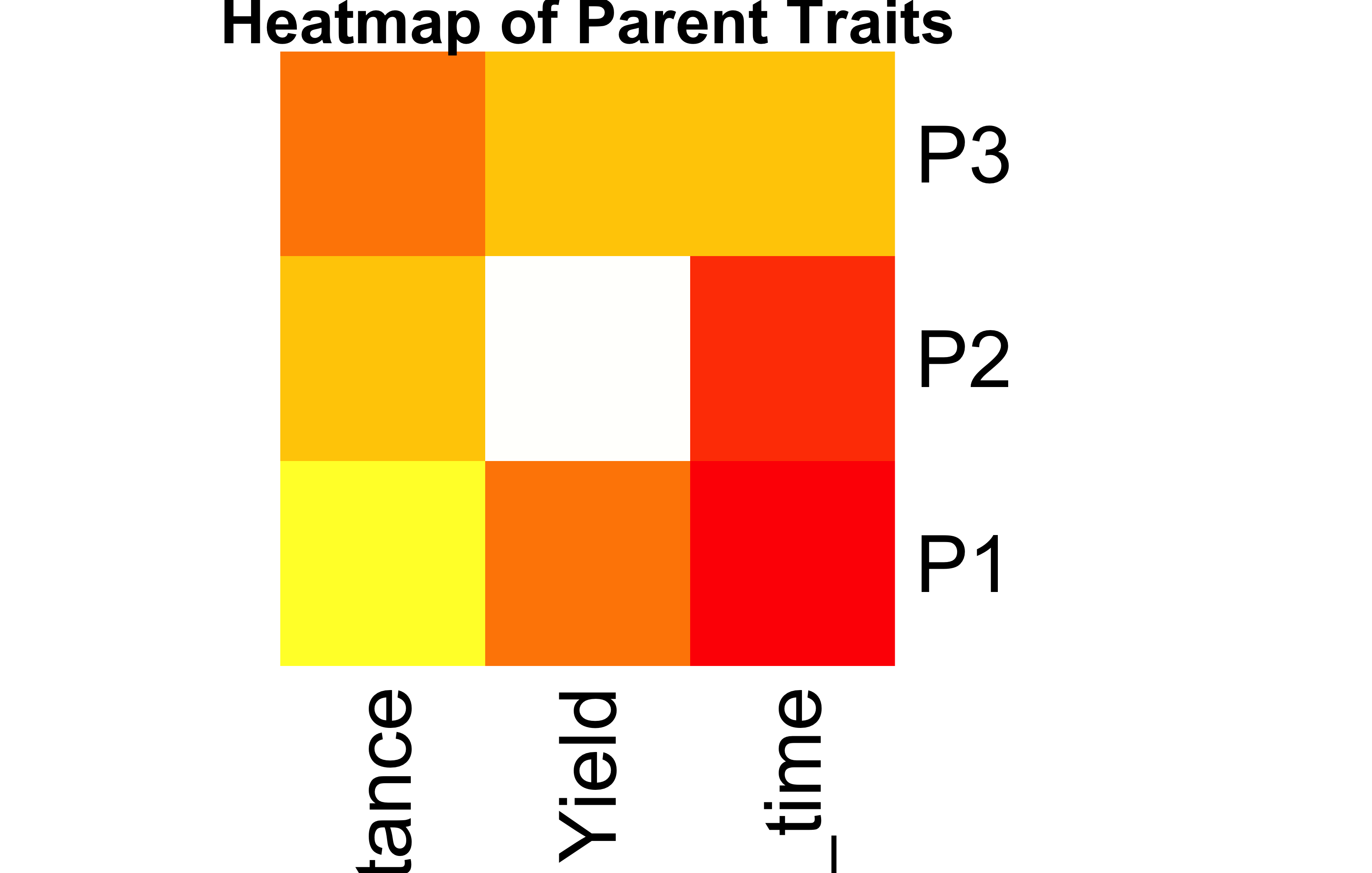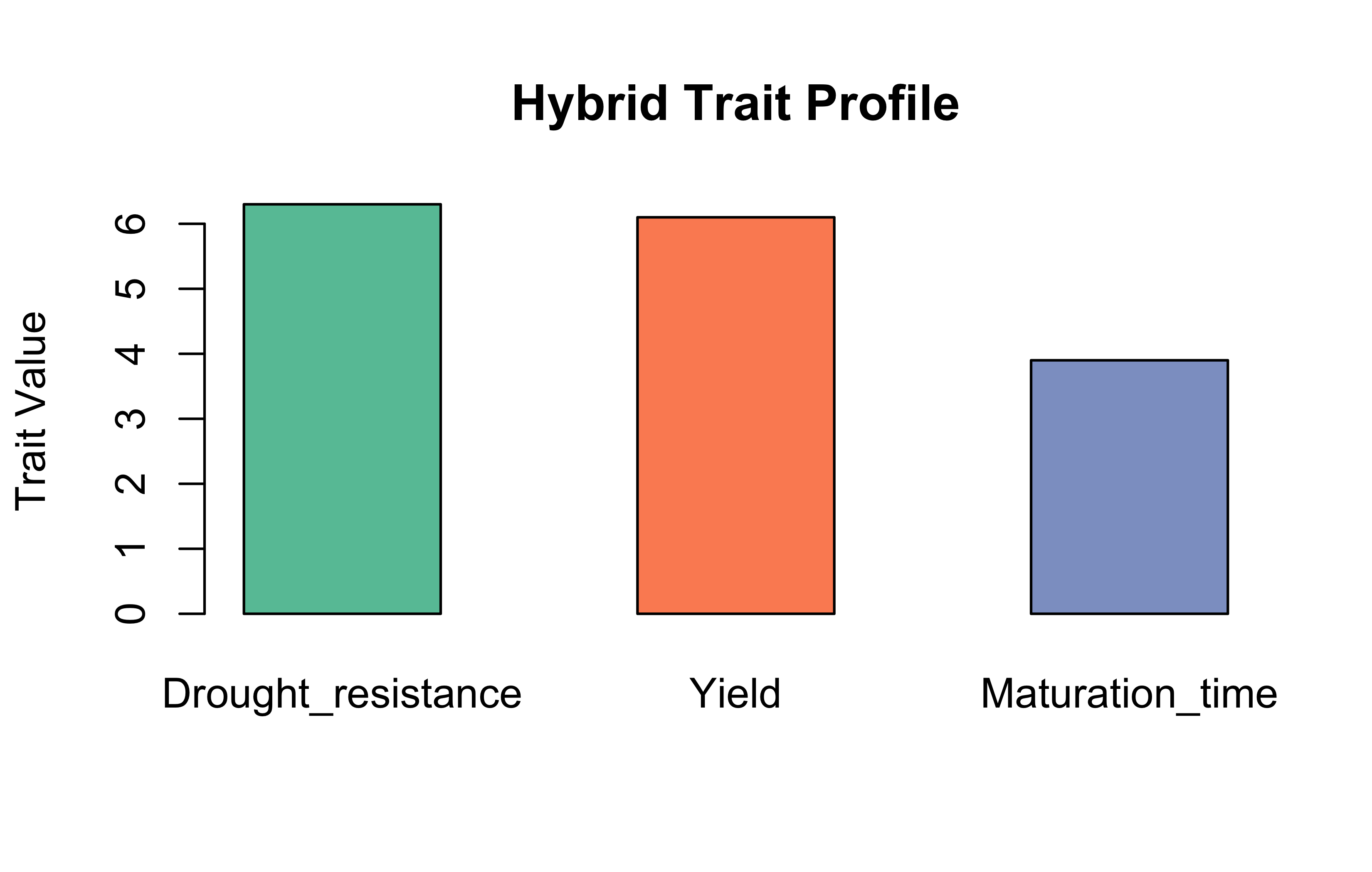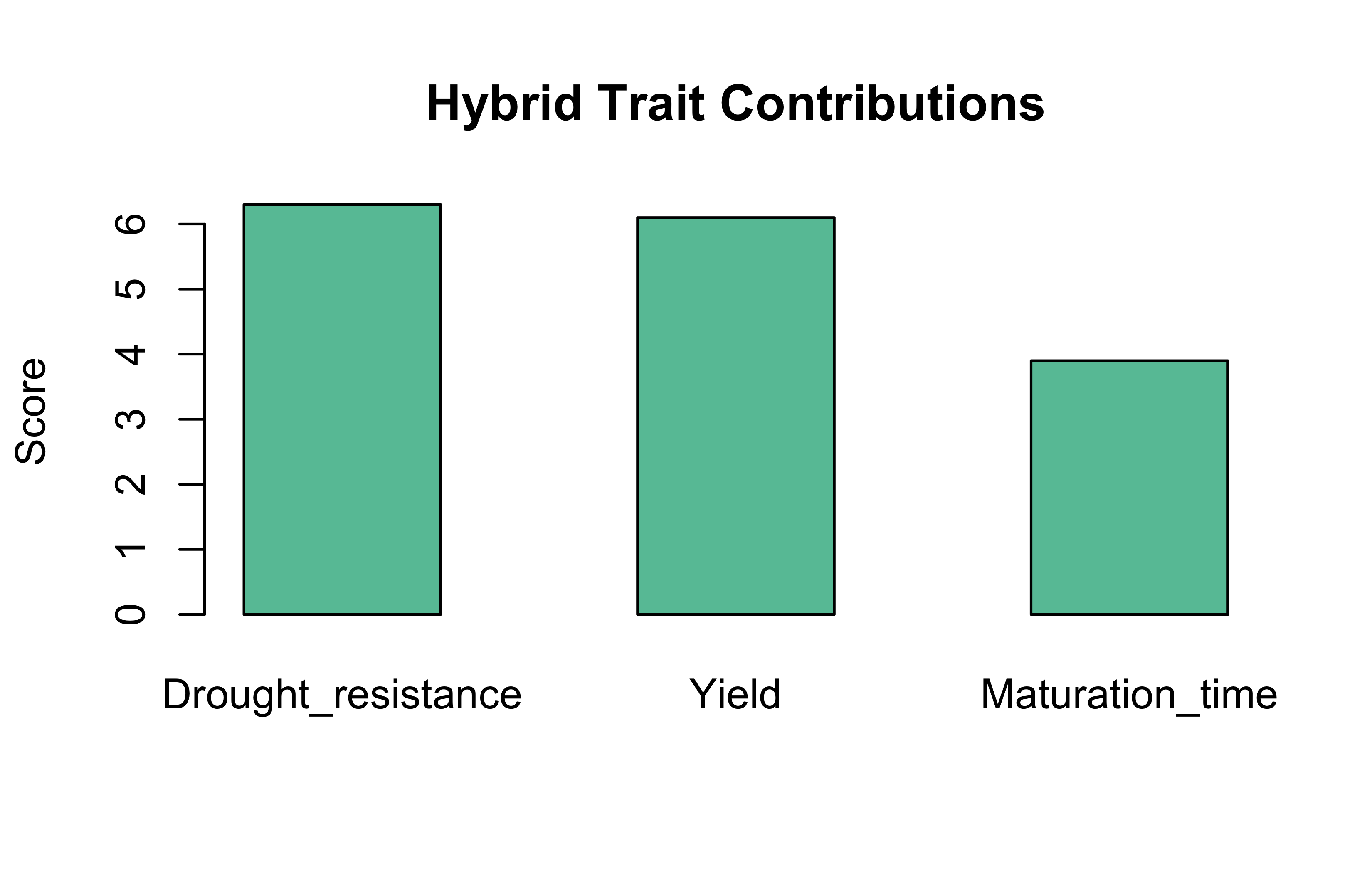 # Remove last trait from ParentTraitsParentSubset<-bioList$Plant$matrix[, 1:2]NewWeights<-matrix(c(0.6, 0.4), nrow =2)# Recalculated hybrid scoreSubsetHybridScore<-ParentSubset%*%NewWeightsSubsetHybridScore
