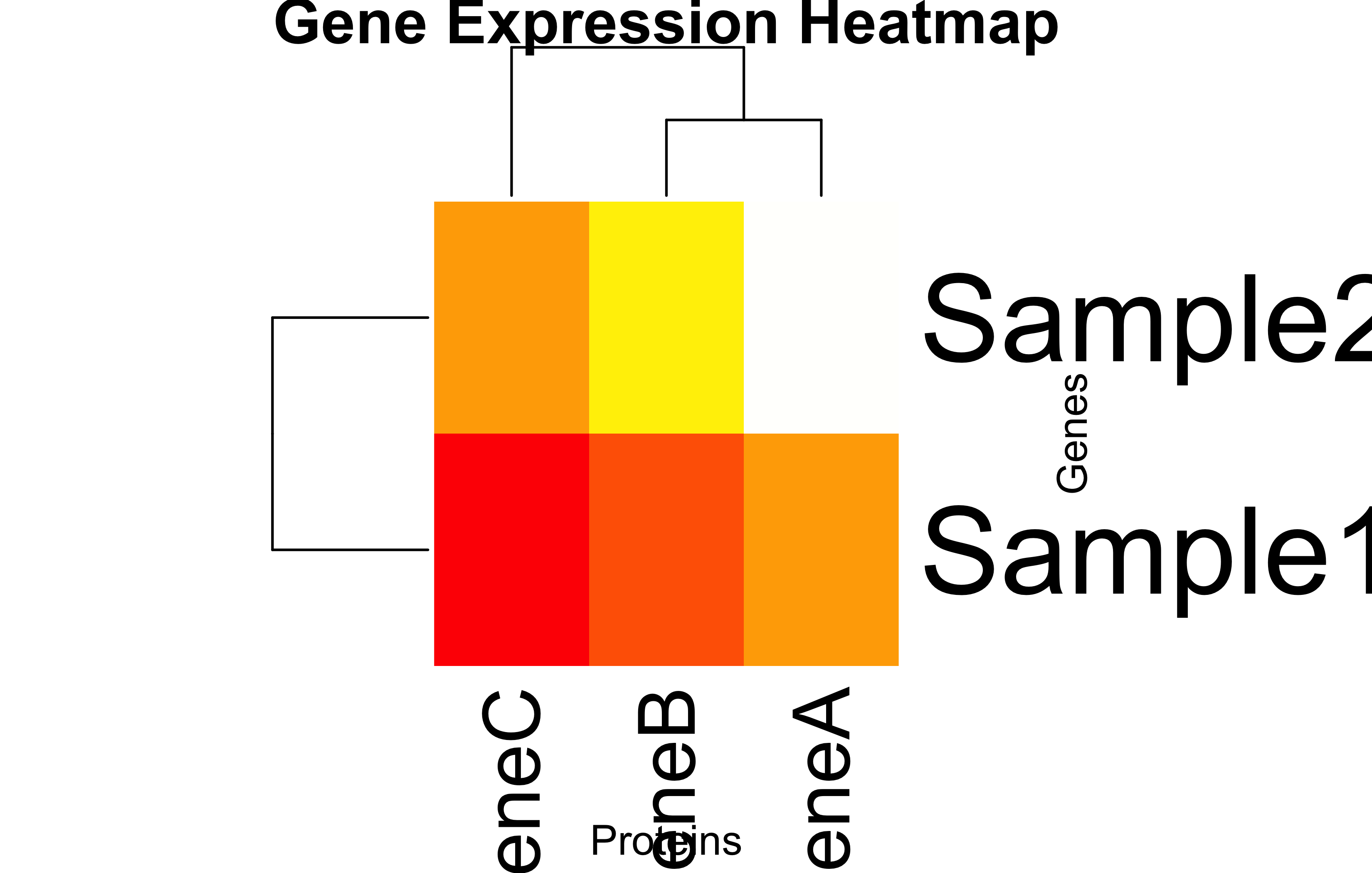 heatmap(bioList$ProteinMap$matrix, scale ="none", col =heat.colors(256), main ="Gene Expression Heatmap", xlab ="Proteins", ylab ="Genes")