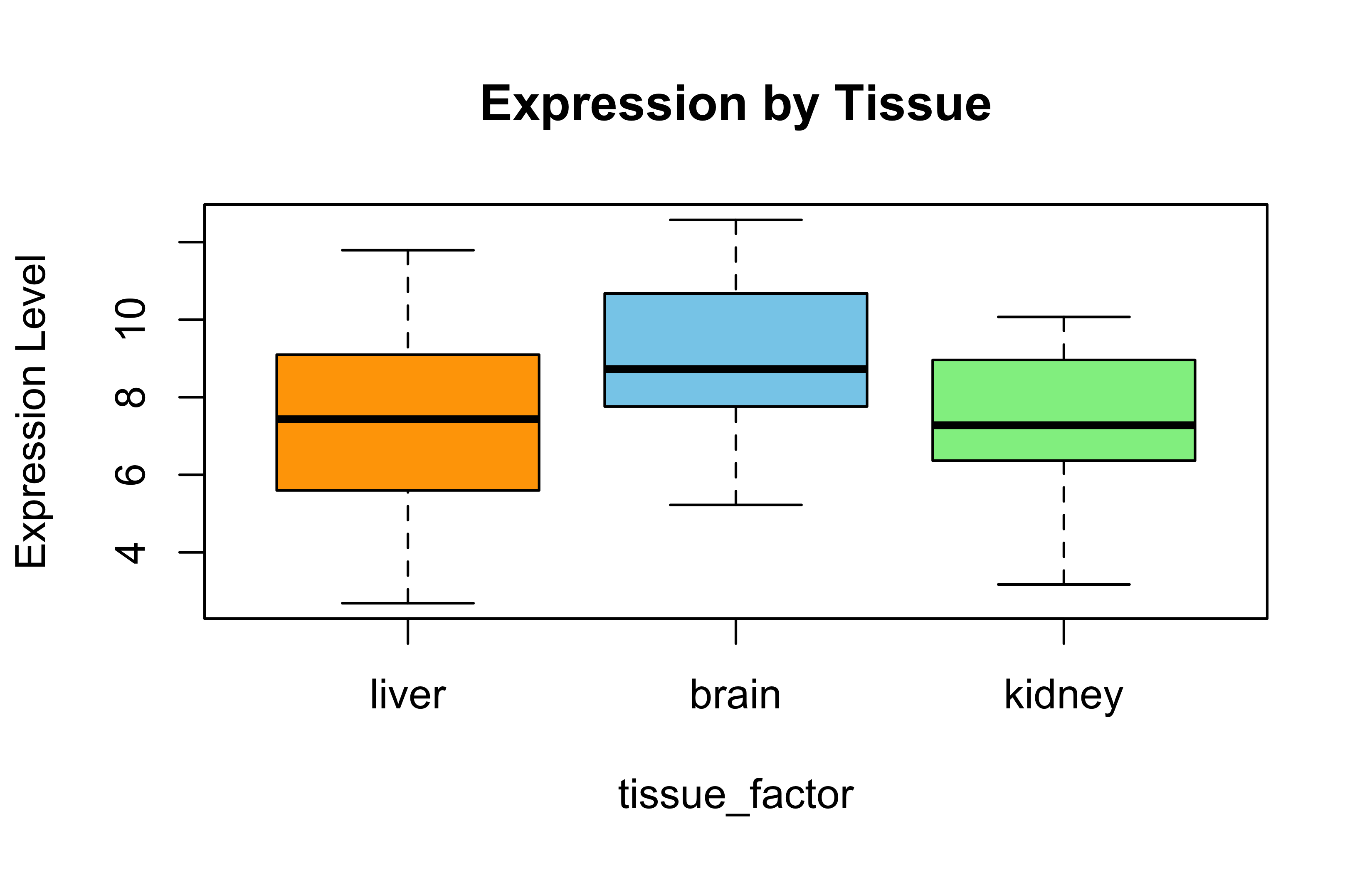 set.seed(42)gene_expr<-rnorm(45, mean =8, sd =2)tissue<-rep(c("brain", "liver", "kidney"), each =15)tissue_factor<-factor(tissue, levels =c("liver", "brain", "kidney"))boxplot(gene_expr~tissue_factor, col =c("orange", "skyblue", "lightgreen"), main ="Expression by Tissue", ylab ="Expression Level")