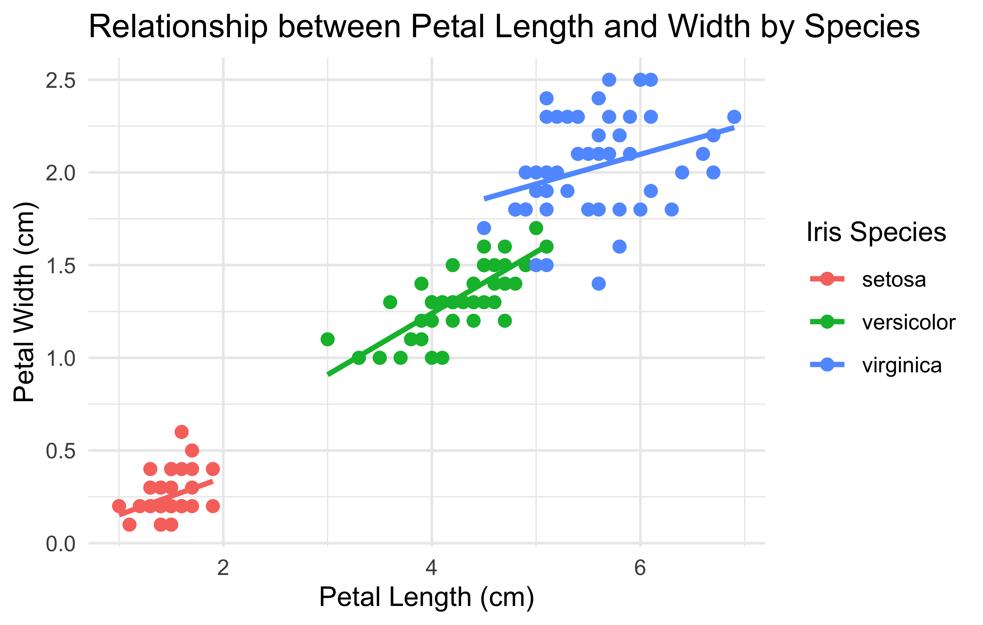 # Load necessary packagelibrary(ggplot2)# Use the built-in iris datasetdata(iris)# Create the plotggplot(iris, aes(x =Petal.Length, y =Petal.Width, color =Species))+geom_point(size =2)+# scatter plot pointsgeom_smooth(method ="lm", se =FALSE)+# linear regression lineslabs( title ="Relationship between Petal Length and Width by Species", x ="Petal Length (cm)", y ="Petal Width (cm)", color ="Iris Species")+theme_minimal()# apply a clean minimal theme