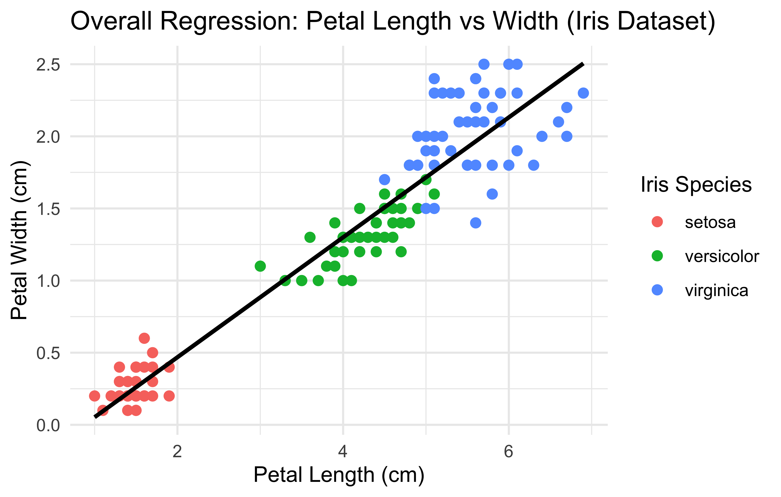 library(ggplot2)ggplot(iris, aes(x =Petal.Length, y =Petal.Width))+geom_point(aes(color =Species), size =2)+# color points by Speciesgeom_smooth(method ="lm", se =FALSE, color ="black")+# single regression linelabs( title ="Overall Regression: Petal Length vs Width (Iris Dataset)", x ="Petal Length (cm)", y ="Petal Width (cm)", color ="Iris Species")+theme_minimal()